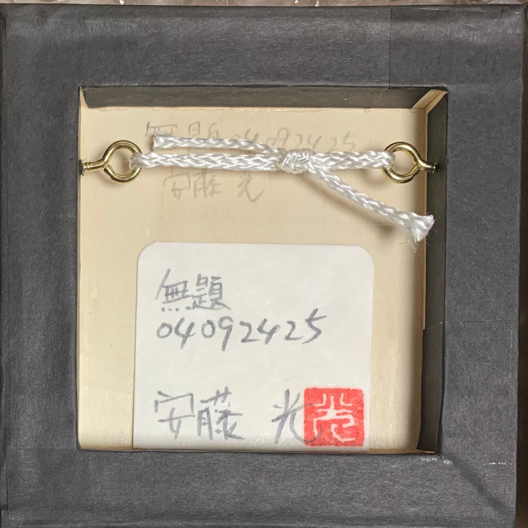 原画裏面にサインと手描きのラベル(共シール)が添付されています。